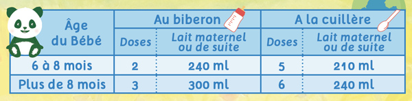 Au biberon : ajoutez la quantité de céréales au lait maternel ou de suite tiède comme indiqué dans le tableau de reconstitution. Ajoutez vigoureusement et circulairement puis verticalement jusqu'à dissolution complète de la poudre.