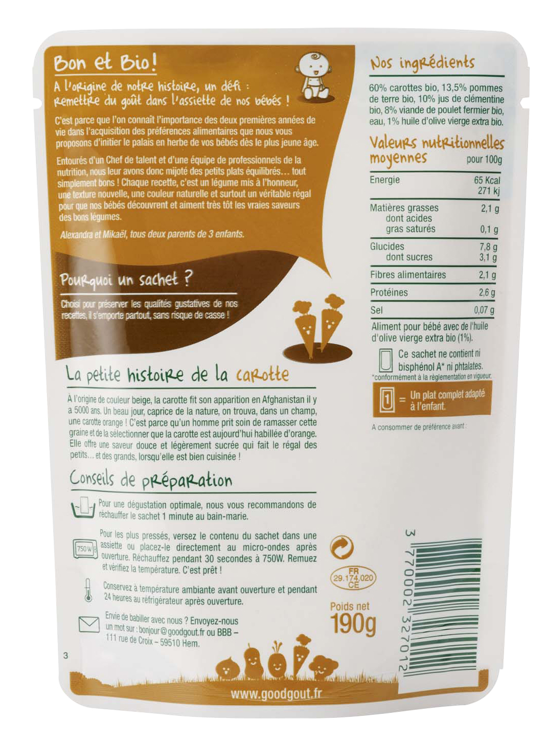 Le Petit Plat Bébé Carotte Poulet Fermier Good Goût c'est : 60% de bonnes carottes, un peu de pomme de terre, juste ce qu'il faut de poulet, une pointe de jus de clémentine et d'huile d'olive, et rien d'autre !